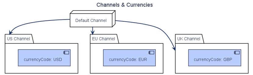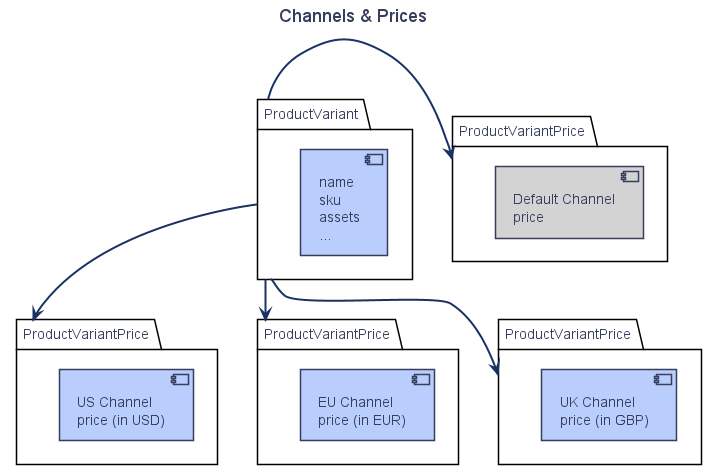 Note: in the diagram above that the ProductVariant is always assigned to the default Channel, and thus will have a price in the default channel too. Likewise, the default Channel also has a defaultCurrencyCode.