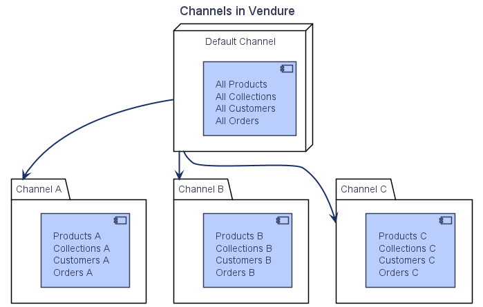 Every Vendure server always has a default Channel, which contains all entities. Subsequent channels can then contain a subset of the above entities.
